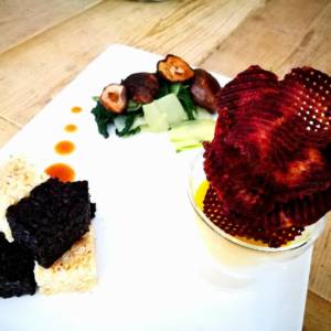 Complementari: Vellutata di barbabietola gialla con acidulato di umeboshi accompagnata da chips di batate viola alla Goffredo. I colori complementari se giustapposti raggiungono il massimo grado di luminosità. Quando vengono mescolati, invece, si annullano, proprio come il fuoco e l’acqua.